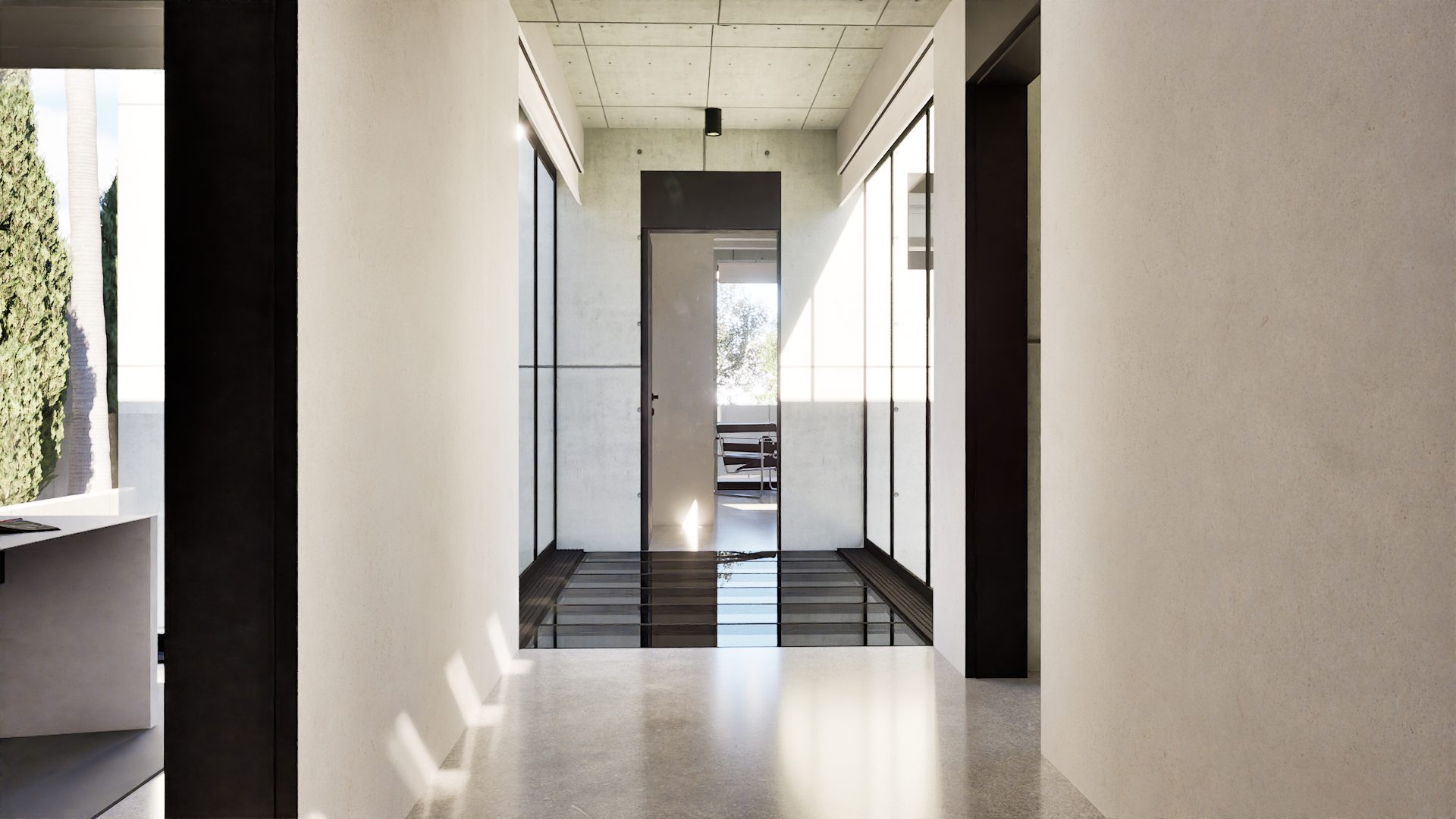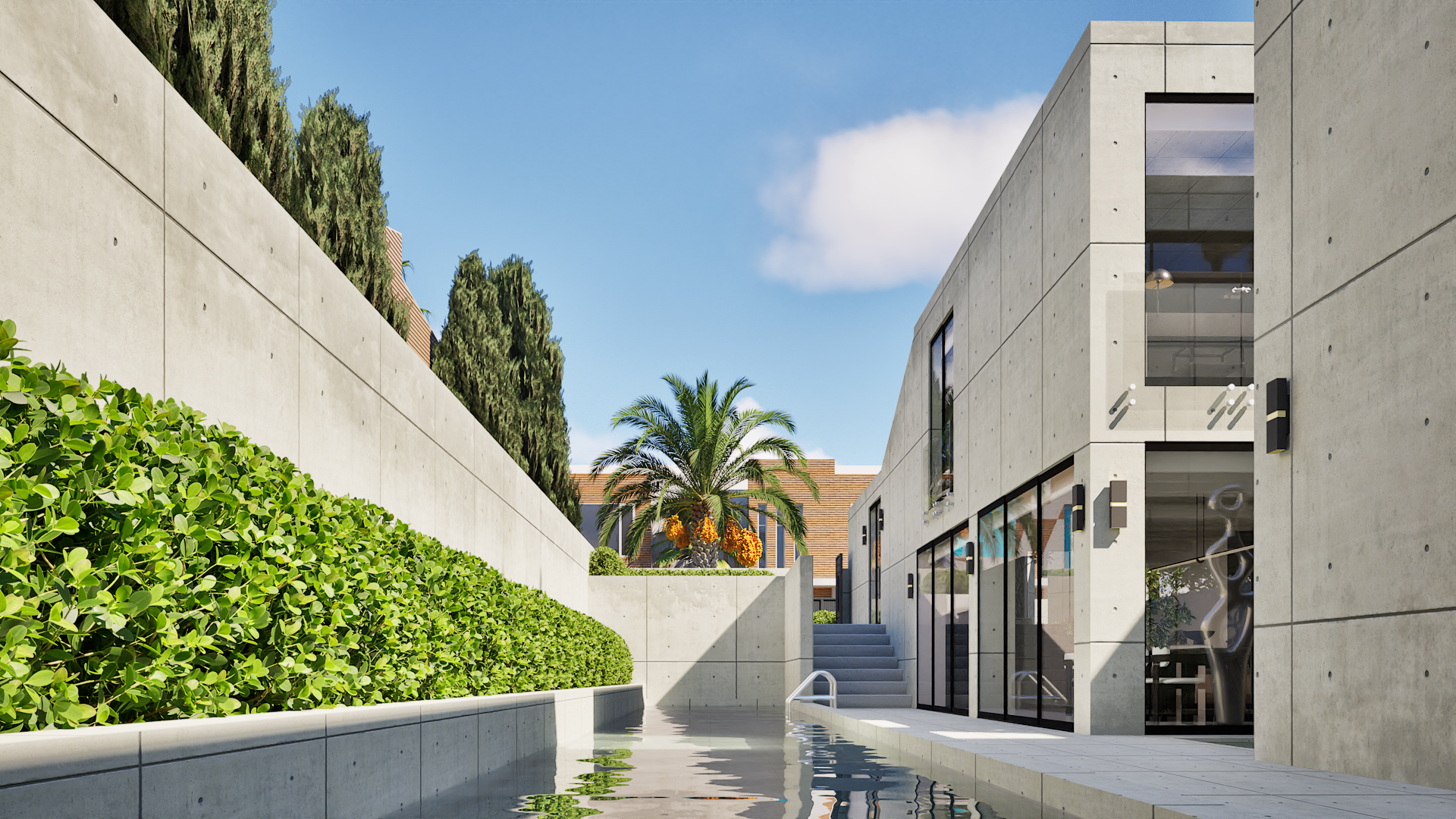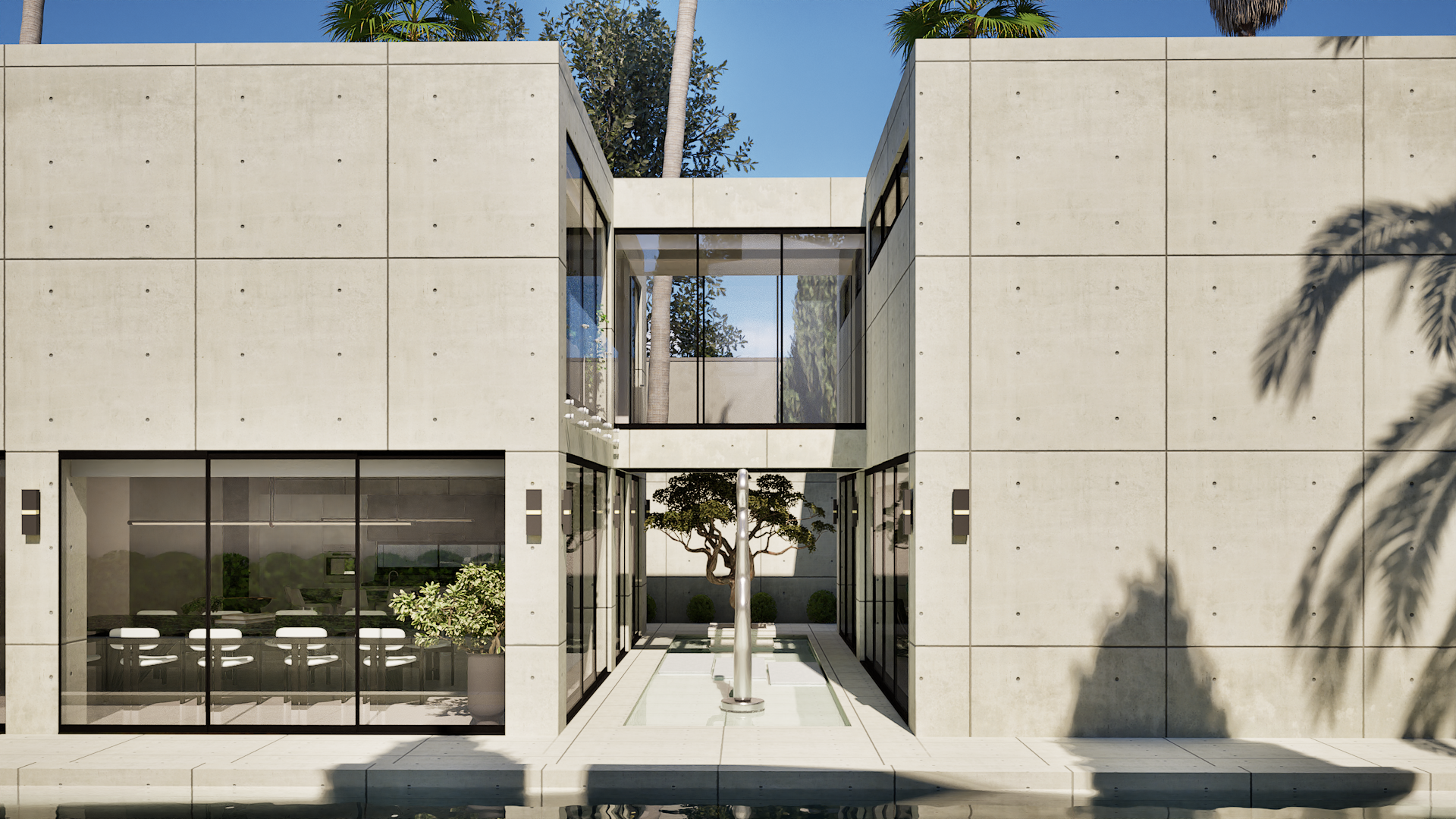 At the center of the plan, a reflecting pond anchors the home. Framed by a mature bonsai tree and a sculpture, this inner courtyard acts as a core that connects spaces through stillness and reflection.