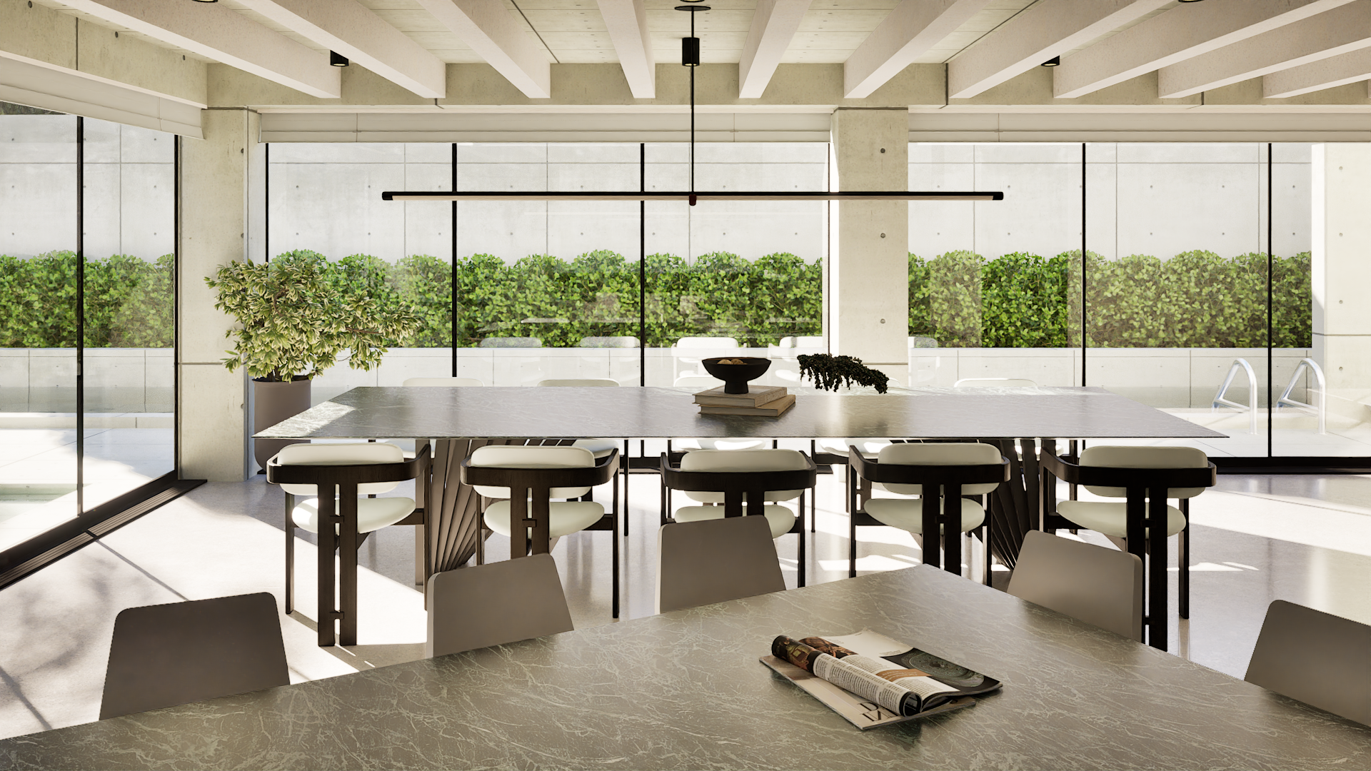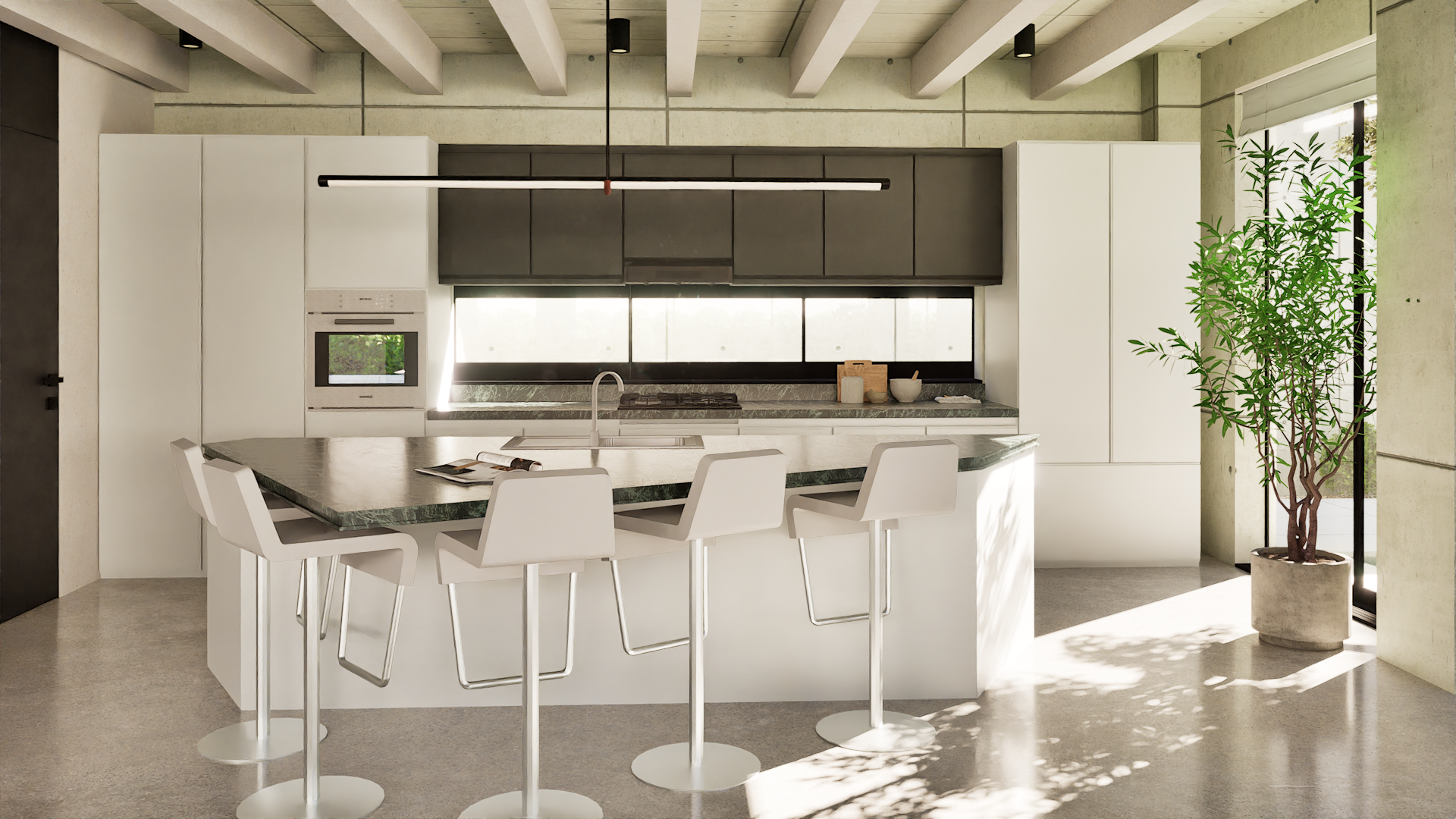 The goal for this project was to allow the architecture itself to perform. A green marble defines the kitchen island, dining table, and countertops, introducing a natural counterpoint to the concrete envelope.
