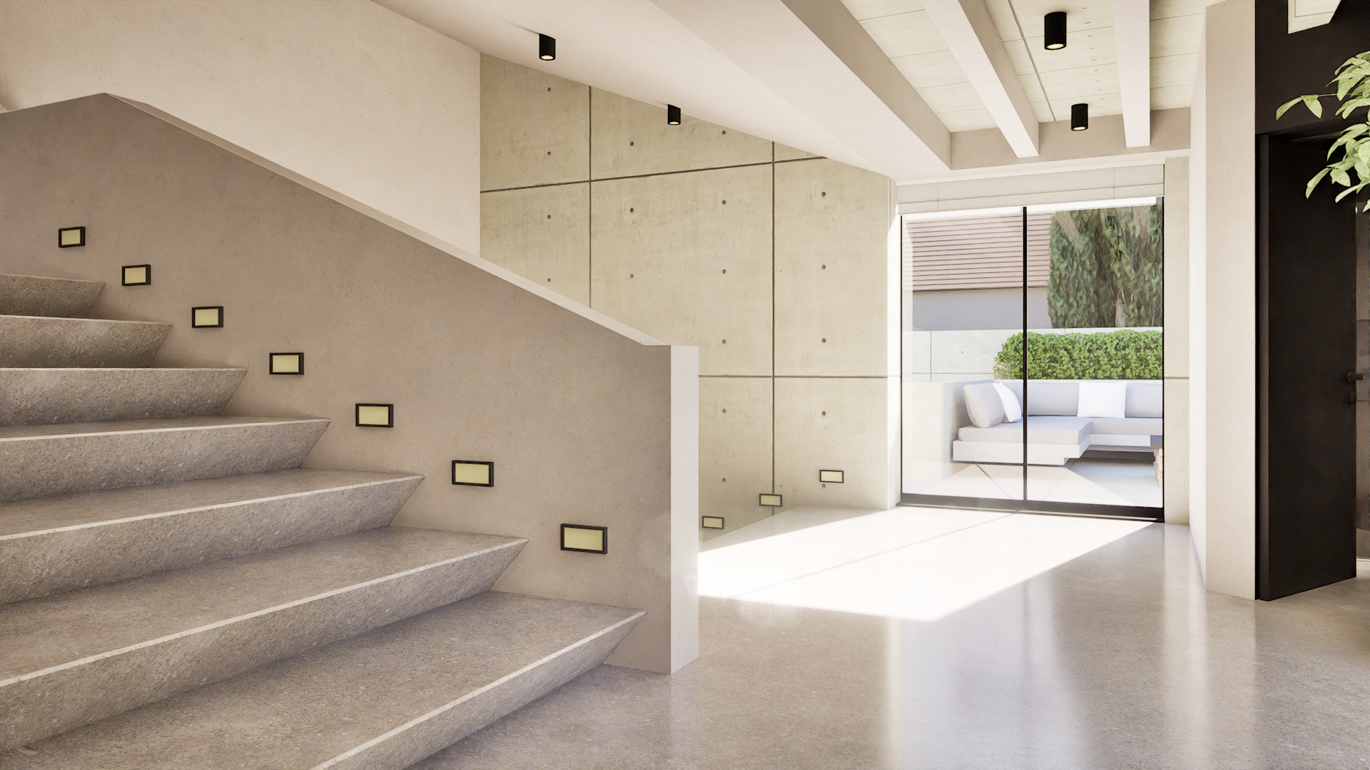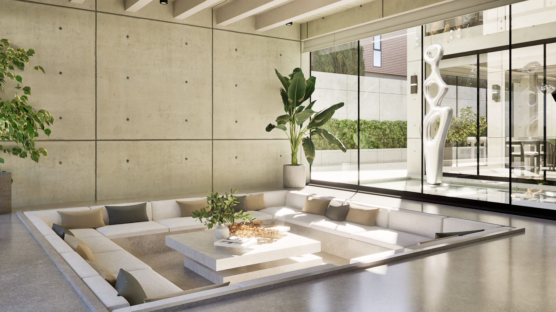 The sunken lounge pit maintains a minimalist emphasis, where texture, shadow, and geometry replace ornament. As daylight shifts throughout the day, it animates the exposed concrete surfaces.