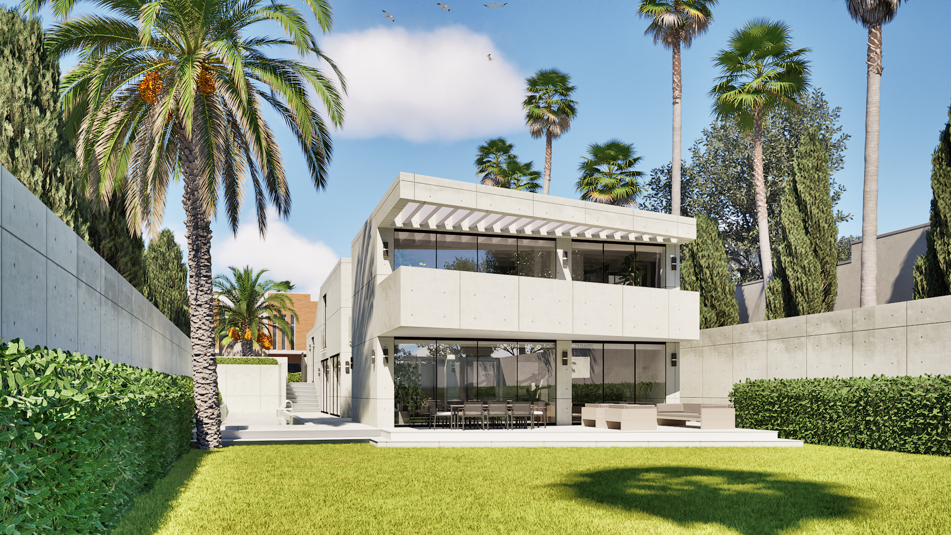 Even the driveway is framed by concrete walls, becoming a gallery-like setting for the client’s car collection.