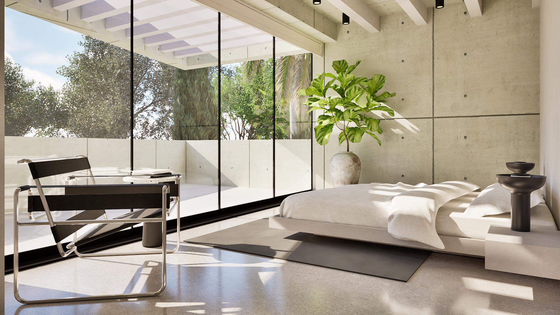 The bedrooms maintain the project’s brutalist language, blending mid-century modern furniture with contemporary design.