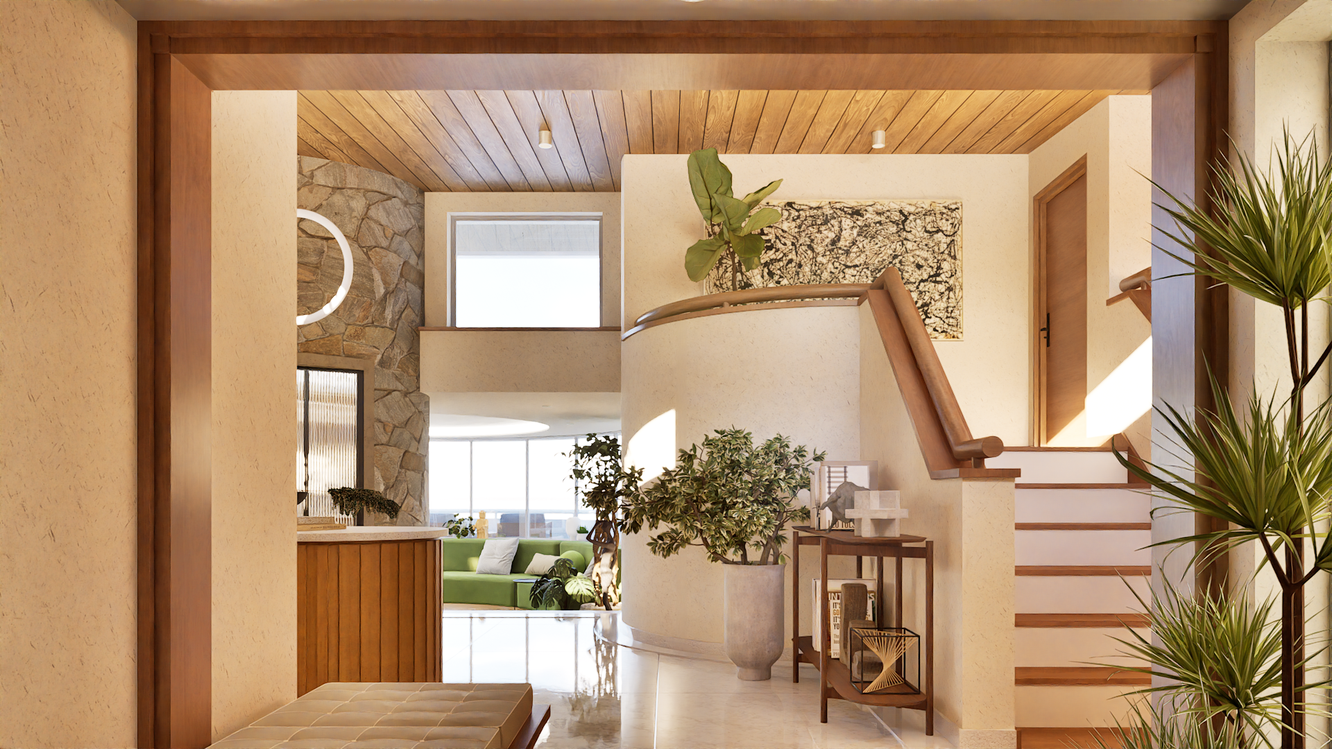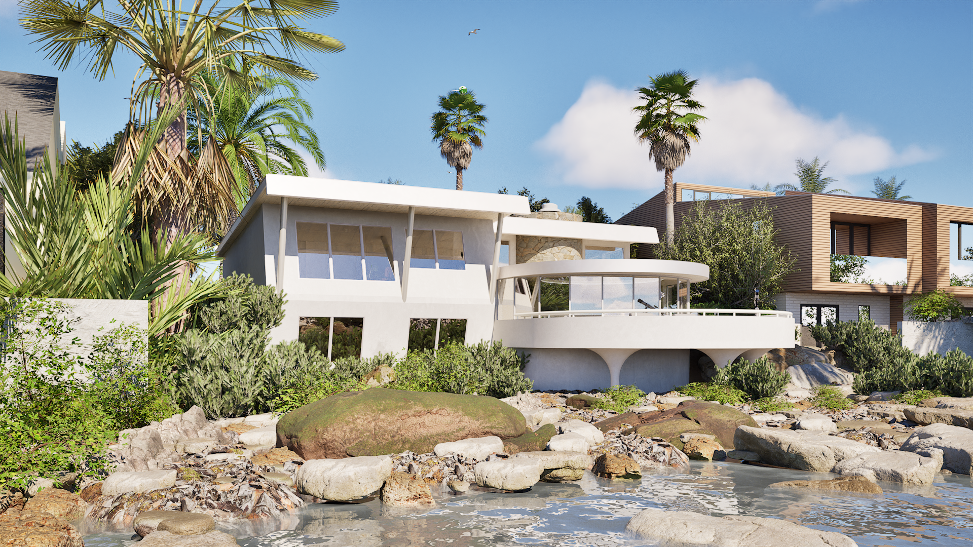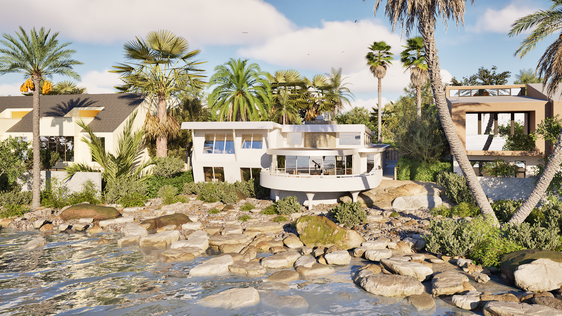 On the upper split, the primary bedroom and ensuite are isolated creating a quiet retreat against the backdrop of ocean and palm trees.