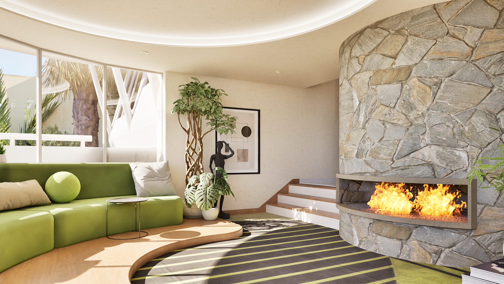 At the heart of the home lies a sunken living room, facing the circular fireplace. large windows wraps 180 degrees, erasing the boundary between the interior and the ocean.