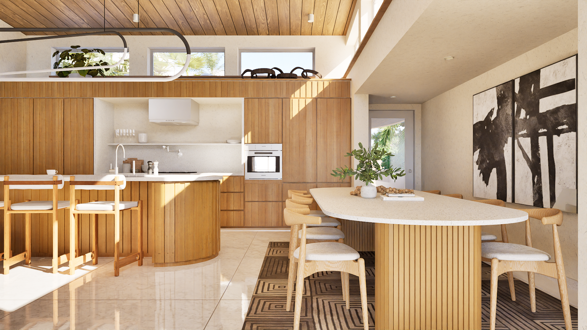The kitchen and dining areas serve as a showcase vertical wood slats providing warmth that offsets the stone floor.