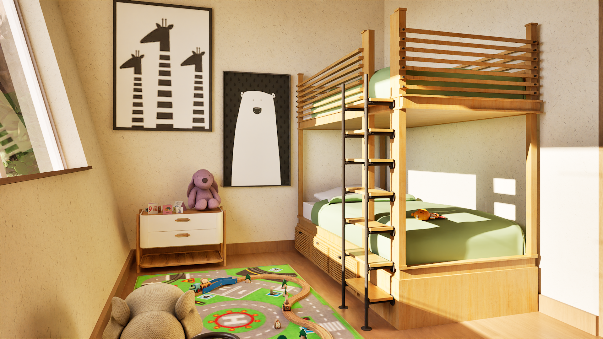 The lower split consists of two bedrooms and a laundry room. One bedroom was designed for guests and the other designed for kids.