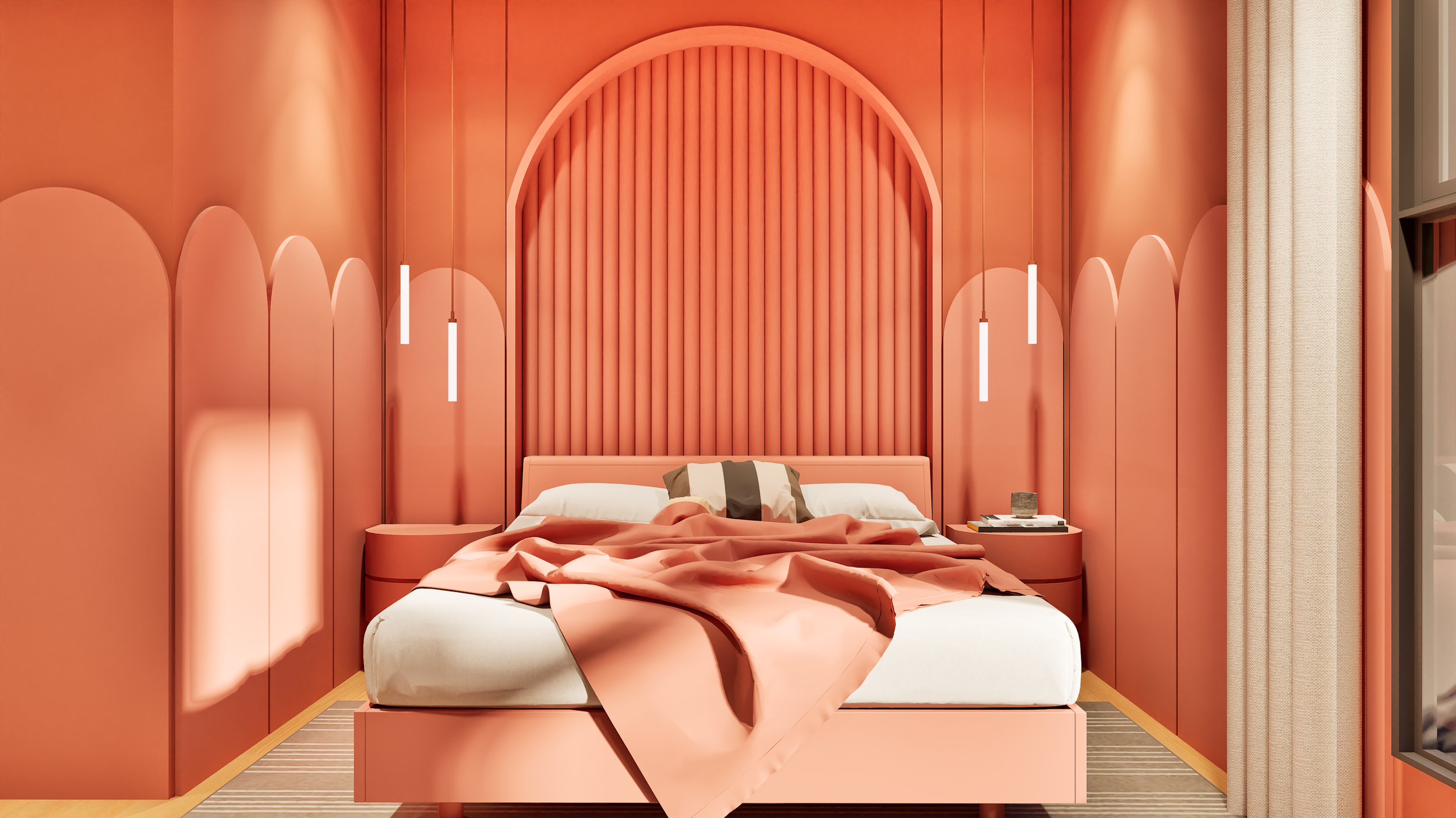 Each of the three bedrooms has its own character, shown through color and materials. This room uses a strong burnt-orange color throughout. A curved slatted headboard wall adds depth, while simple hanging lights on each side of the bed create a warm and balanced feel.