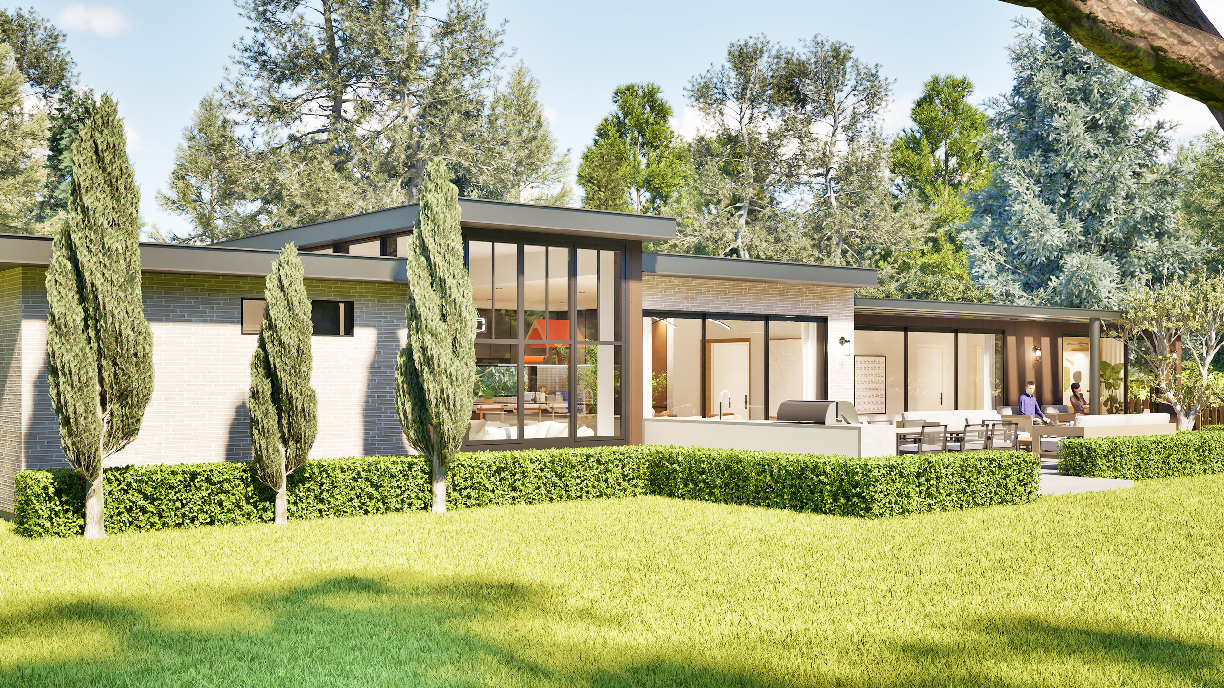 The back of the house connects the indoor and outdoor living. Sliding glass doors open onto a patio with an outdoor kitchen, dining table, and seating area.