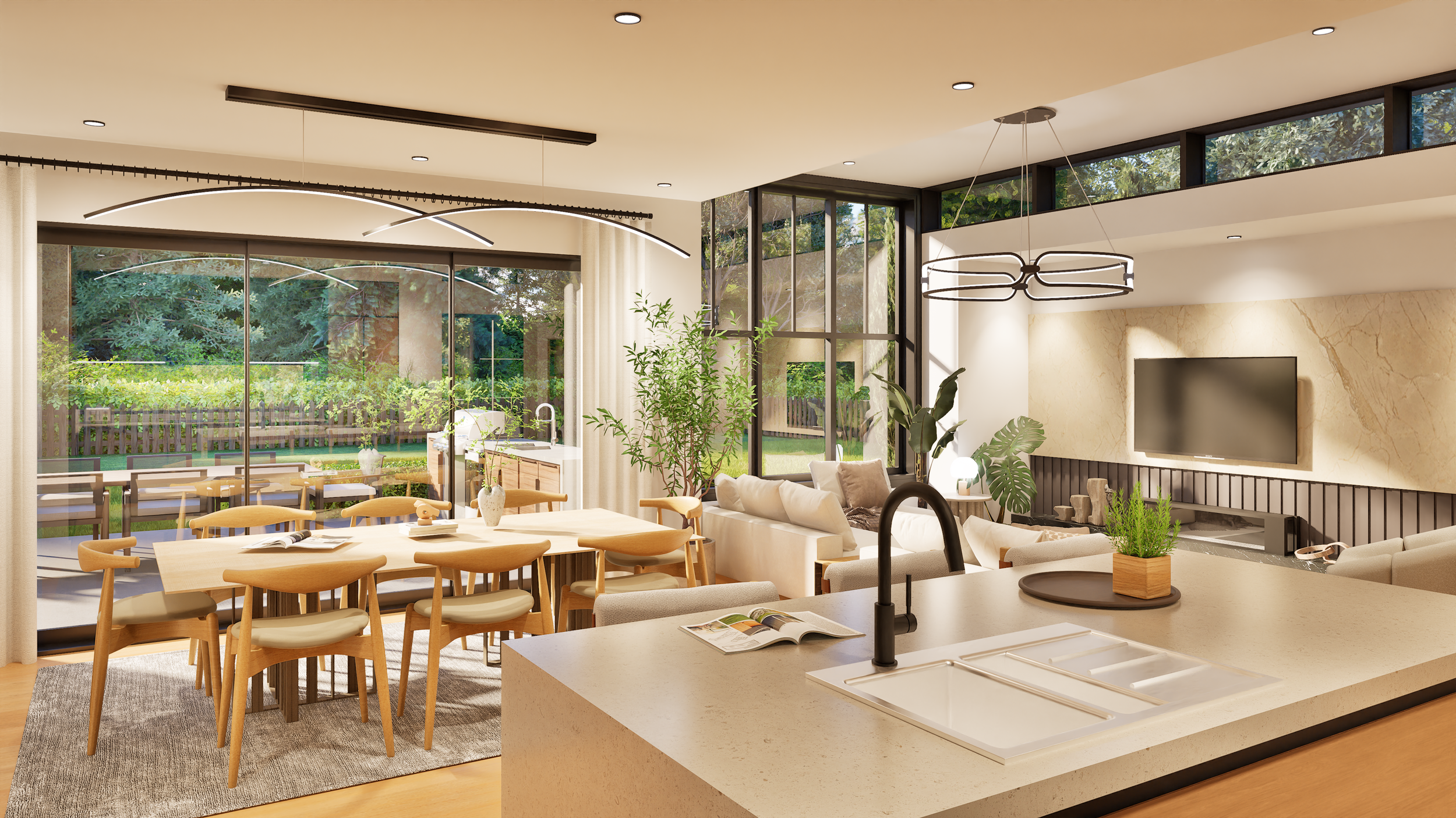 The dining area sits beside a large sliding door that opens to the backyard. Clerestory and full-height windows flood the open space with natural light, casting shifting patterns throughout the day.