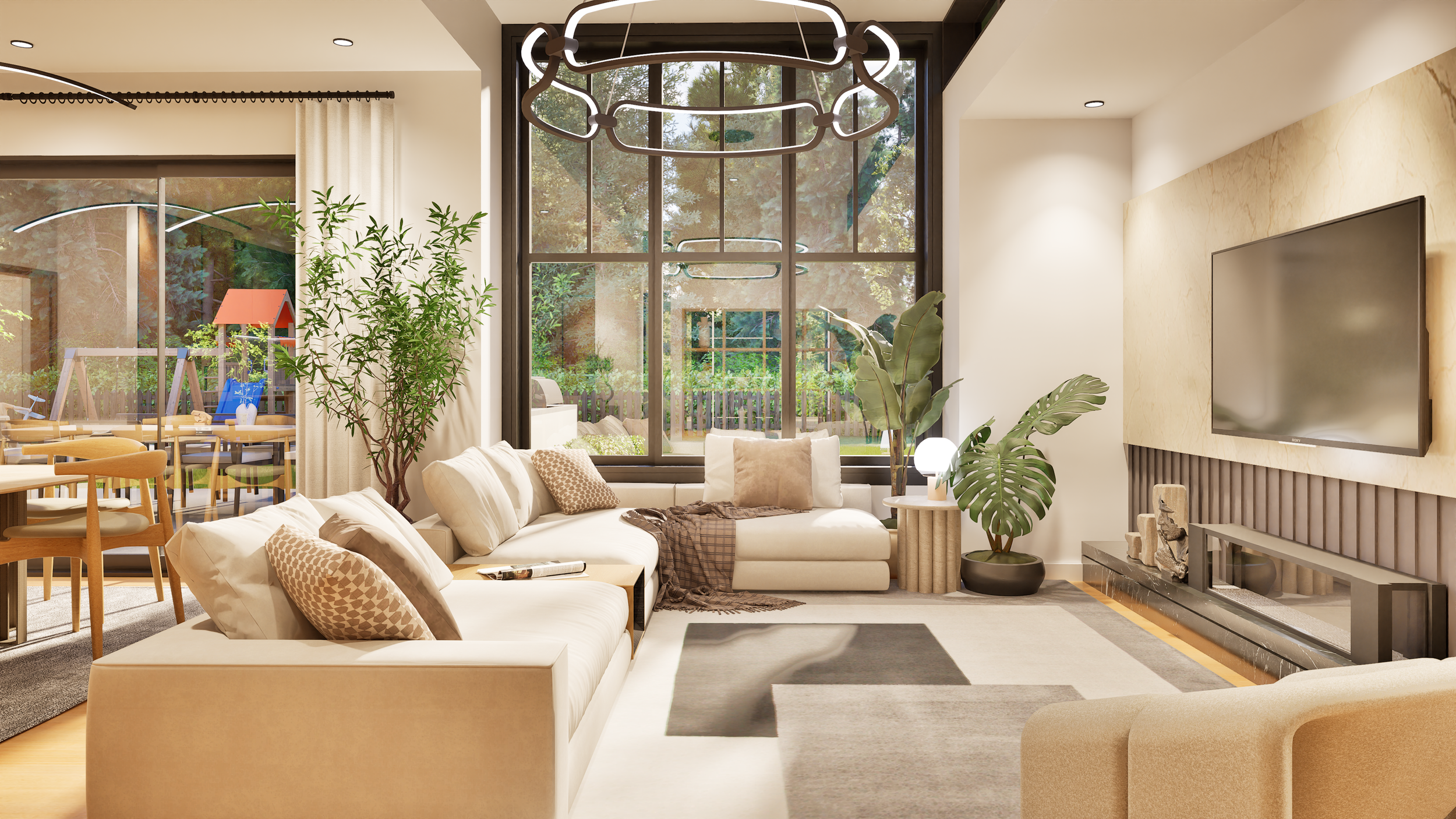 The main living space is centered around a large L-shaped sofa. A TV is mounted above a dark slatted fireplace. Tall windows look out onto the backyard, bringing greenery into the space and making the outdoors feel like part of the room.