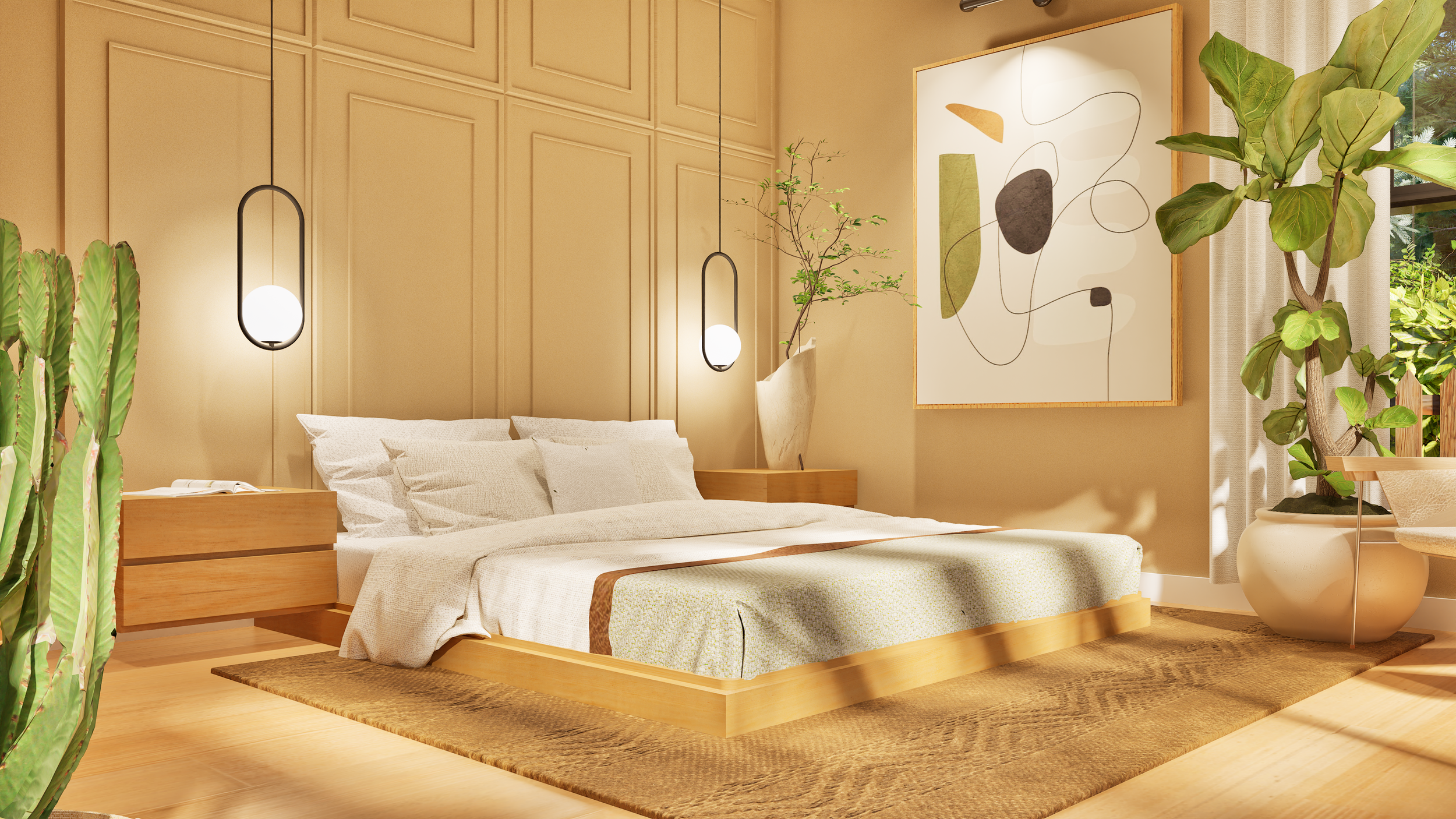 The primary bedroom is calm and relaxing, using beige tones and light wood finishes.