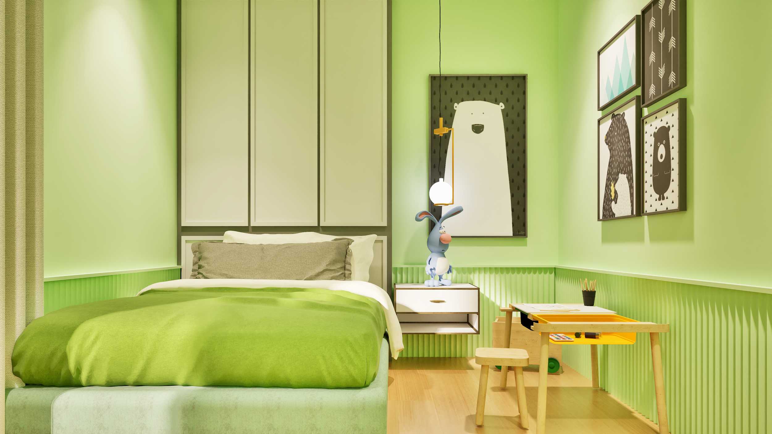 Designed to be fun and lively, this room uses bright green tones. It includes a study desk, wood paneling on the lower walls, stuffed animals and fun artwork.